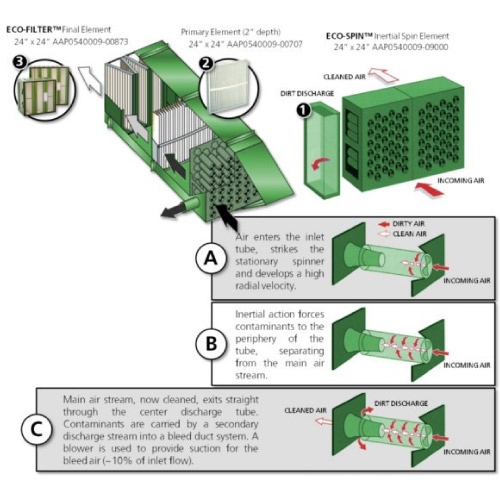 ECO-SPIN™進氣過濾系統使用慣性旋轉技術去除進氣氣流中的較大微粒(98% @ 15μm),保持降流濾芯的使用壽命。對於大氣中較大懸浮微粒濃度高的重型環境,ECO-SPIN是極佳的解決方案。可選擇ECO-SPIN作為過濾附件,搭配新的壓縮機構造,或用於已安裝於工地的壓縮機,作為螺栓式升級。